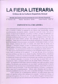 La Fiera Literaria impresa sobre papel es el boletín del Centro de Documentación de la Novela Española y, según pensamos, el único elemento en España, quizá en el mundo, de lo que el profesor Vidal Beneyto ha llamado “resistencia cultural”. Resistencia frente a la llamada Industria Cultural, que ha convertido el libro, del portador de valores éticos y estéticos que era, en simple mercancía, con la connivencia de los escritores del sistema, los profesores, la Academia y el Ministerio de Cultura. La Fiera es mensual (julio-agosto, un número) y sólo circula por suscripción a anualidades completas. Para tener acceso a ella tendrías que mandar, si eres residente en España, 35 euros (un año) por medio de talón al portador cruzado, o a nombre de Pablo García, al APARTADO 42082 - 28080 MADRID (poniendo en el sobre sólo lo que hemos puesto en mayúsculas) o, preferiblemente, por transferencia a la cuenta de Caja de Madrid 2038 1177 56 3000211983, a nombre del mismo, diciéndonos, por correo ordinario o rellenando el siguiente formulario, la dirección a donde quieres que se te hagan los envíos.